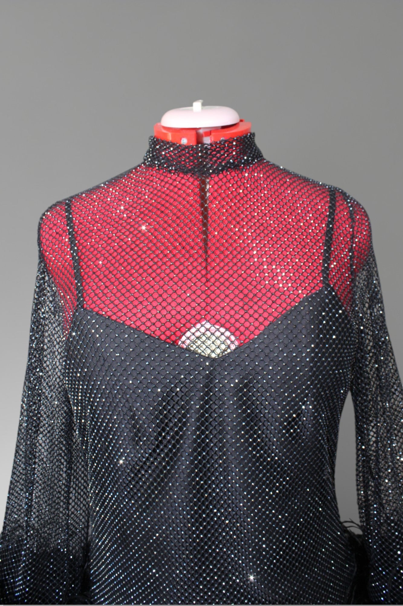 MARAYA Plus Size Black Rhinestone Mesh High Neck Long Sleeve Bottom Mini Feather Dress