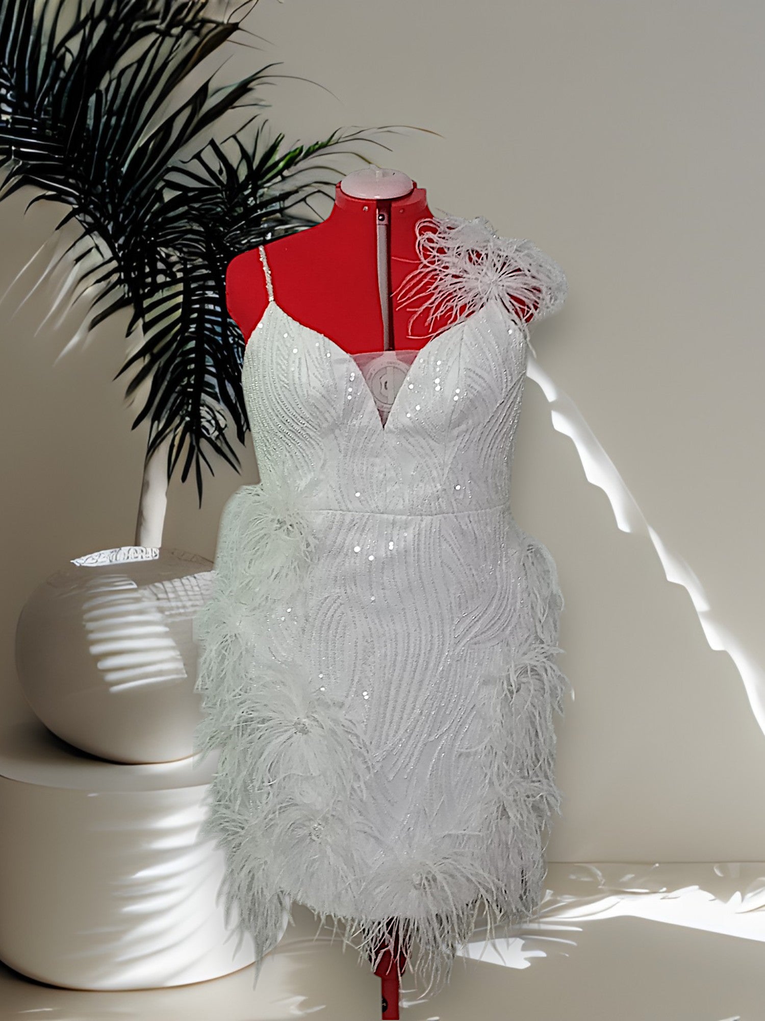 MARAYA Plus Size White Rhinestone Sleeveless V-Backless Mini Feather Dress Wedding Dress