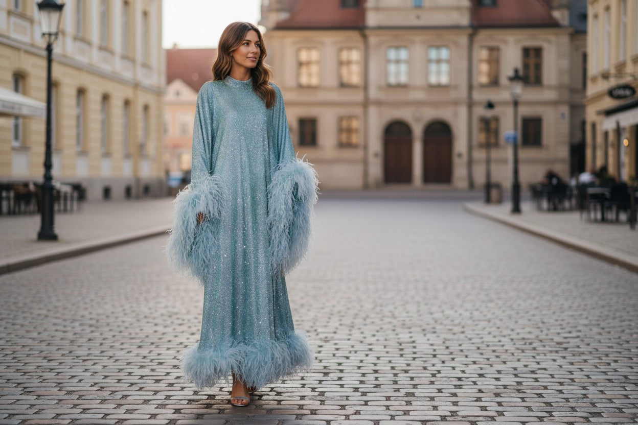 MARAYA Metallic Sparkle Bell Sleeve Feather Maxi Dress (Size 0 US. - 8 US.)