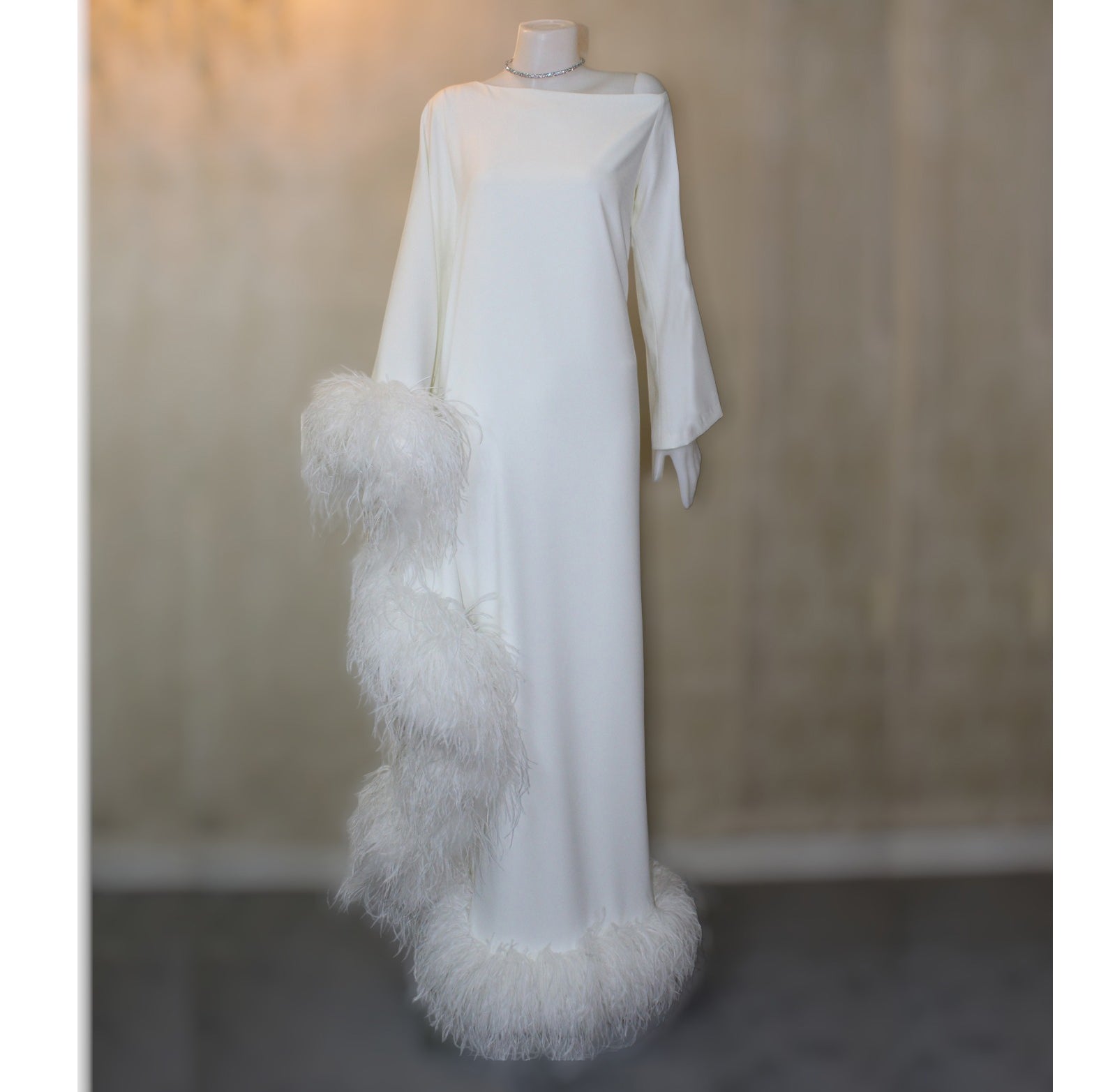One-shoulder feather Dress, Evening dress with large sleeves, Stunning style decorated with feather Trim for a statement look.