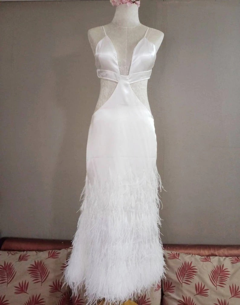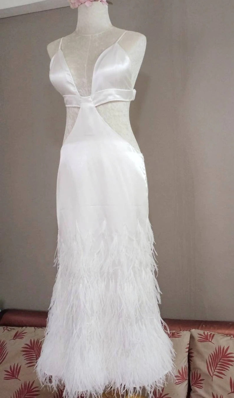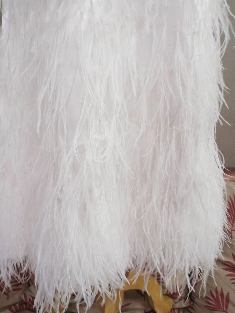 White Spaghetti Strap dress decorated with feathers, mermaid style. white wedding dress, long white mermaid skirt, prom dress, Bridal size 10-14