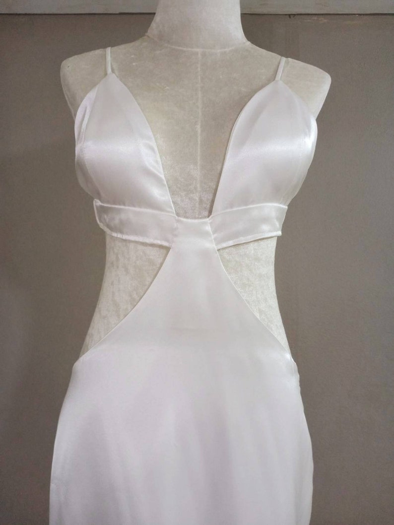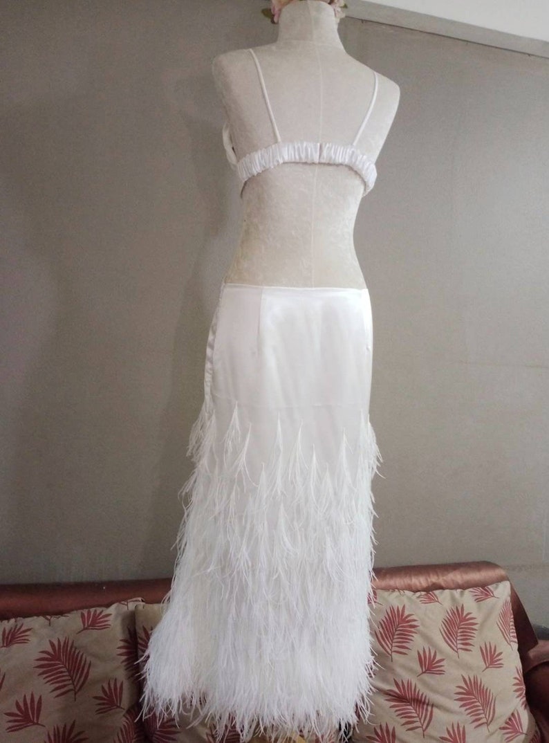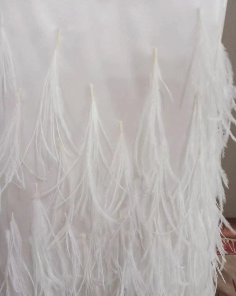 White Dress is artfully adorned with ostrich feathers cascading to the hem. The silky satin fabric is lined and drapes down from the bust in thoughtful cutouts that flatter the small of the waist. Thin shoulder straps reveal an open back. The rear, elastic strap is adjustable with a hook and eye closure. The skirt sits on the hips and has a side zipper.